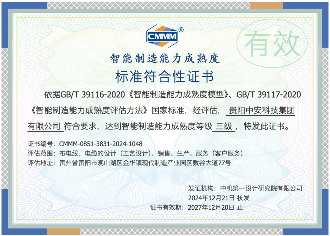 据工业和信息化部装备工业发展中心统计,2024年度全国仅423家企业获得国家智能制造能力成熟度三级认证,中安是我国线缆行业第6家获得认证的企业,也是贵州省第一家获得认证的线缆企业。