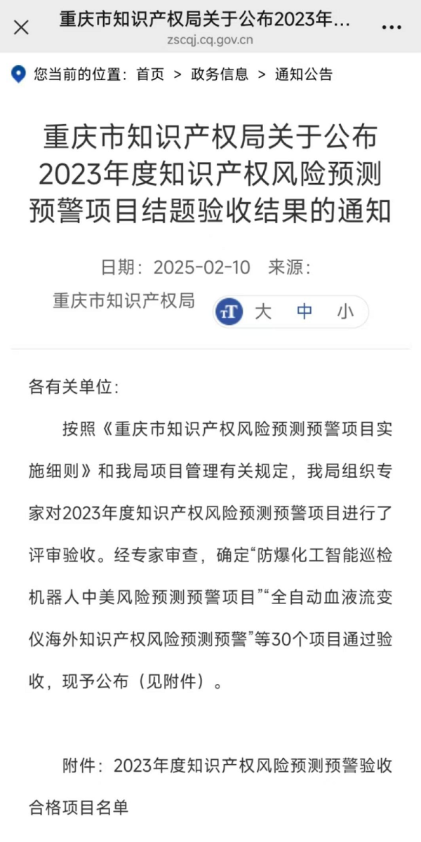近日,重庆市知识产权局公布了2023年度知识产权风险预测预警项目结题验收结果,鸽牌公司的“基于电线电缆及其关键制造技术的专利分析及风险预警项目”,凭借出色的成果顺利通过验收,这是鸽牌公司在知识产权保护与创新发展道路上的一个重要里程碑。