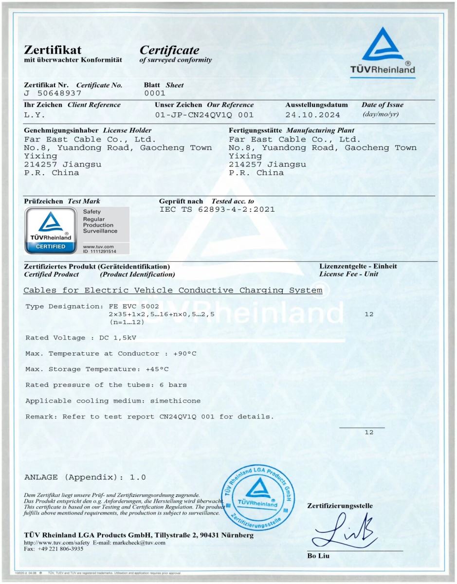 该产品获得了莱茵TÜV在国内颁发的首张液冷充电桩电缆产品认证证书,和UL认证。还通过了耐高温制冷剂腐蚀测试,具有优异的抗爆破、耐气候、抗UV测试、耐低温等特性,保障充电安全。