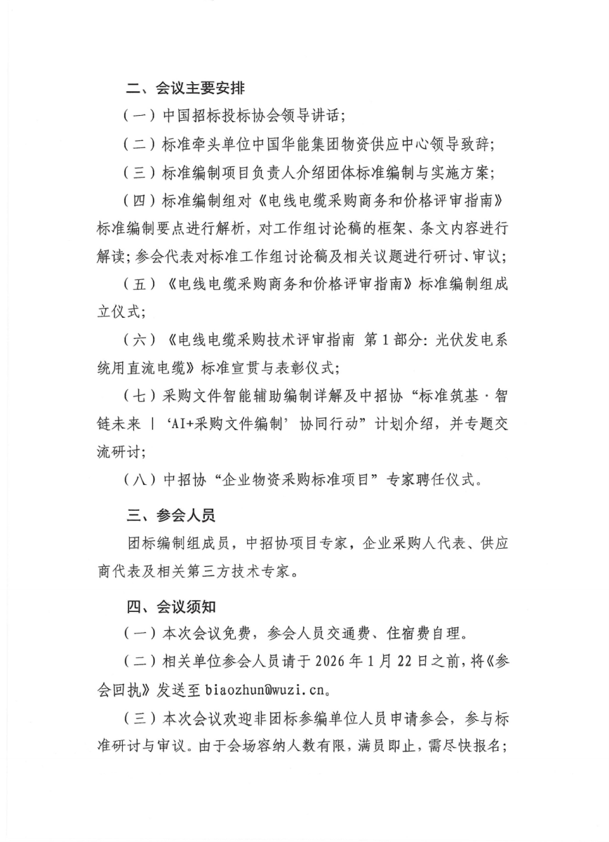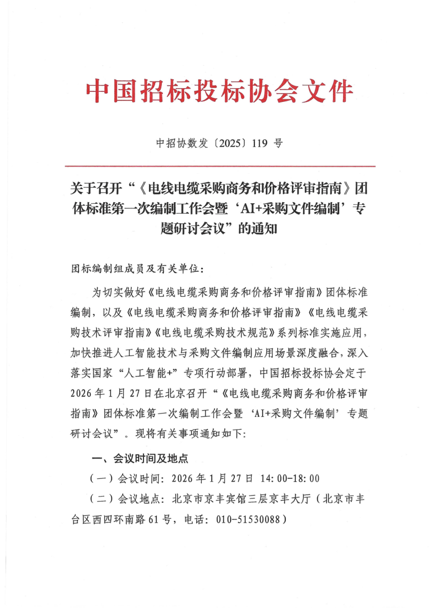 1.关于召开“《电线电缆采购商务和价格评审指南》团体标准第一次编制工作会暨‘AI+采购文件编制’专题研讨会议”的通知